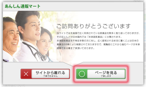 国内では認可されていない医薬品を多く取扱っているため、サイト閲覧の際には以下のページがまず初めに表示されています。右側の「〇 ページを見る 了承します」ボタンを押してから公式ホームページへ進んでください。