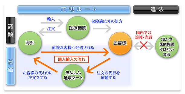 あんしん通販マート(旧あんしん通販薬局)は違法なサイトと思っている方もいることでしょう。日本で承認されていない医薬品を売っているからです。個人輸入代行業者は個人が法律の範囲内で海外から薬を取り寄せるのに必要な手続きを本人に代わって行っています。