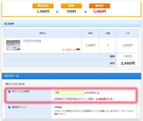 表示されているポイントの内、利用したポイント数を入力することで1ポイント=1円として商品代金の割引きが受けられるのです。