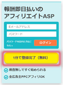 黄色いボタン(1分で登録過料(無料))をクリックしてアフィリエイター登録フォームを開く