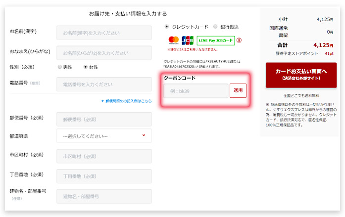 保有しているポイントやクーポンを利用することで商品の値段を割引いて購入することができます。利用の方法は、以下の画面で必要な使いたいポイント数やクーポンコードを入力することで、合計金額から一定額が値引きとなるのです。
