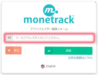 くすりエクスプレスアフィリエイトの紹介ページで参加登録ボタン(登録はこちら)をクリックして、公式アフィリエイトサイト「monetrack(マネートラック)」のアフィリエイター登録フォームを開く