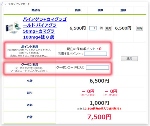 貯まったポイントやお薬通販部のTwitterなどSNSサイトで配信しているクーポンは、以下のショッピングカートのページで使用します。