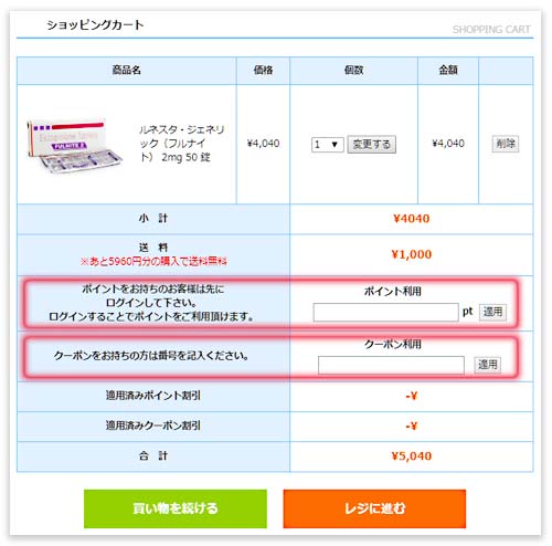 お悩み宅急便のポイントやクーポンは、注文の際に「ショッピングカート」のページで利用します。それぞれの項目に入力することで、商品の合計金額から所定の値引きを受けることが可能です。